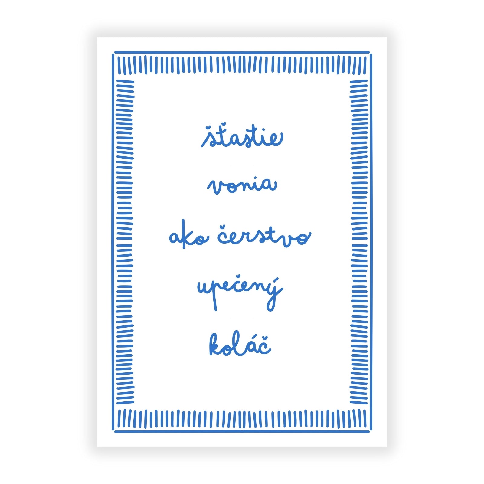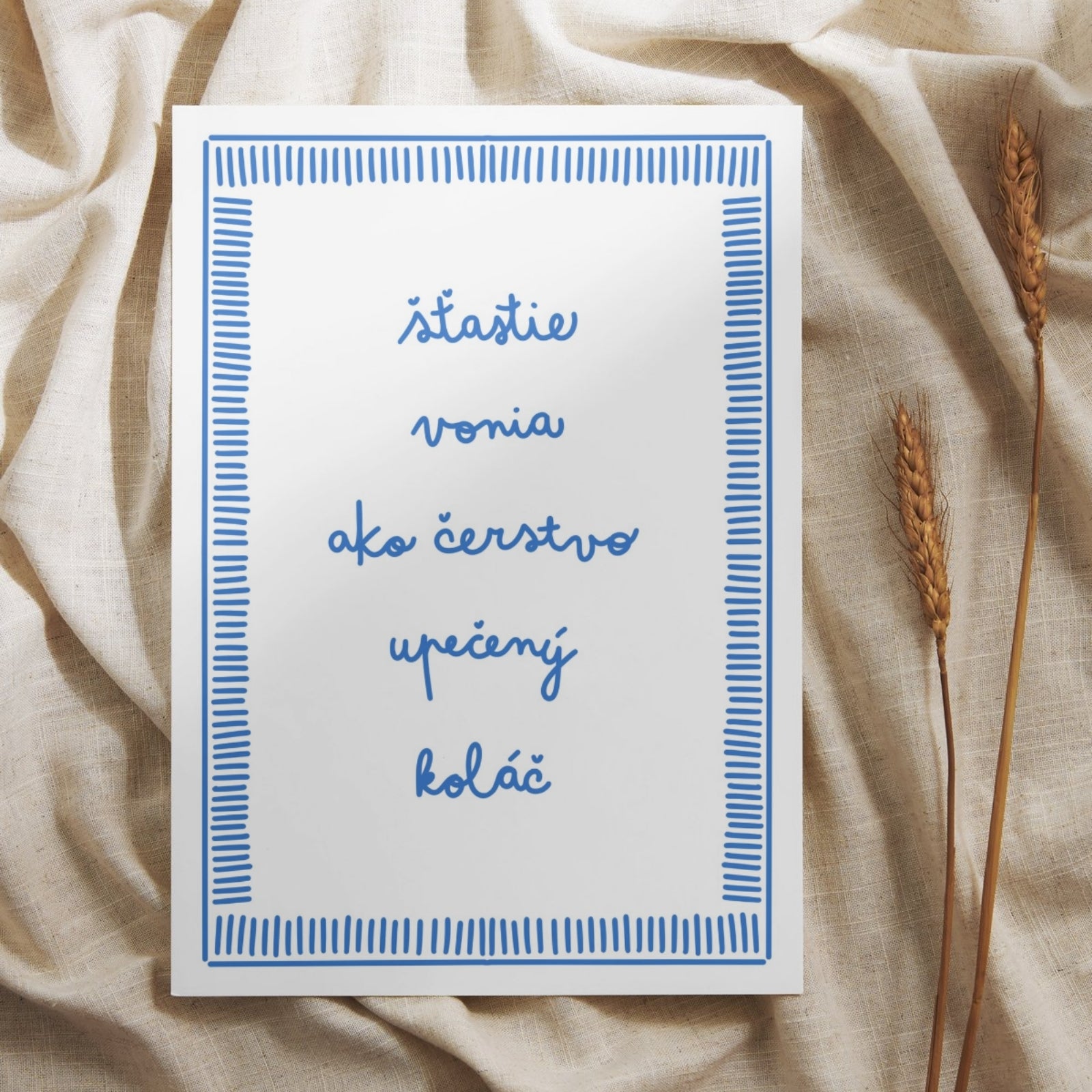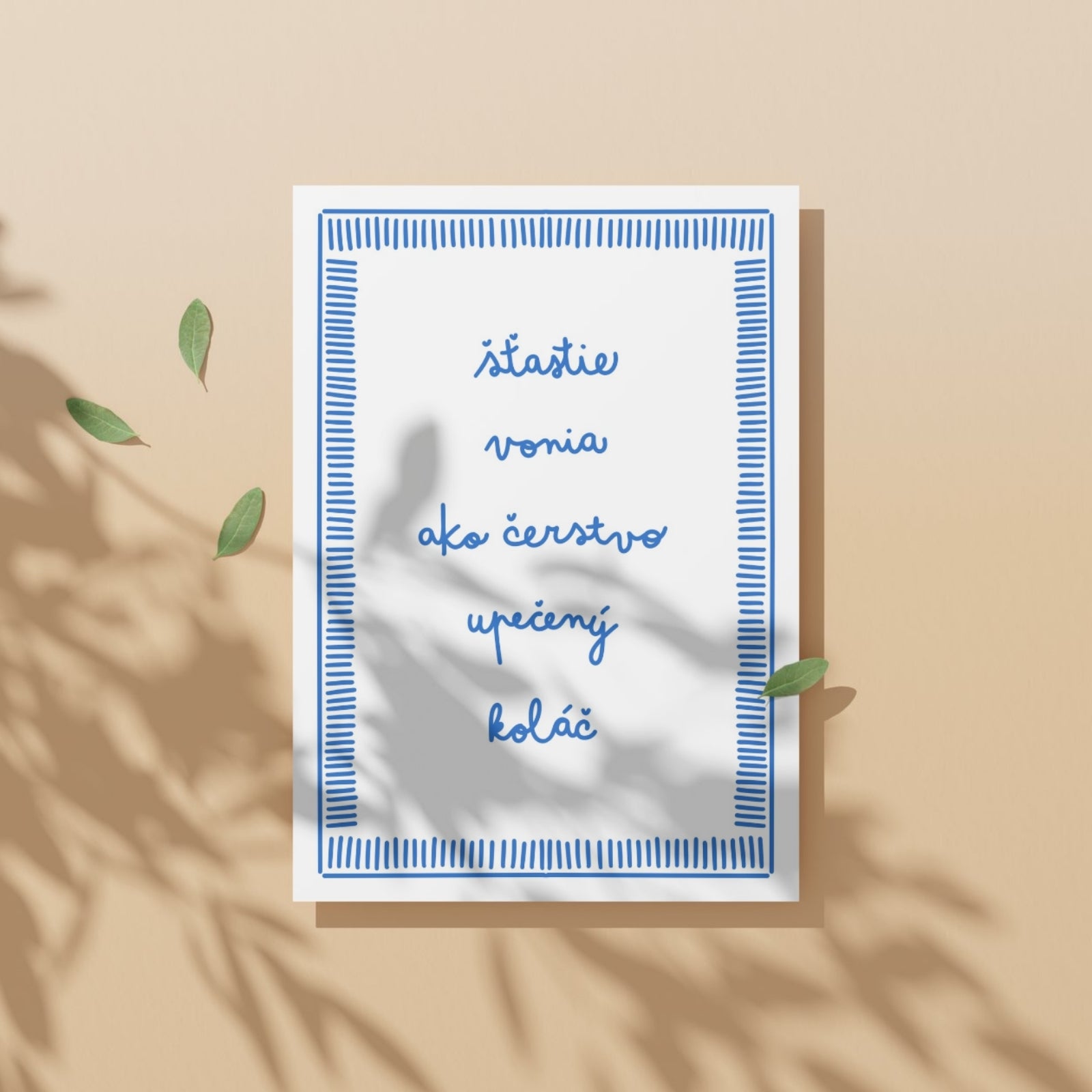 Jemný plagát v modro-bielom prevedení s citátom „Šťastie vonia ako čerstvo upečený koláč“ a ilustráciou voňavého koláča. Je vytlačený na jemnom a pevnom papieri, ktorý má FSC certifikát. Tento plagát vnesie do vášho domova atmosféru pohody a tepla domova.