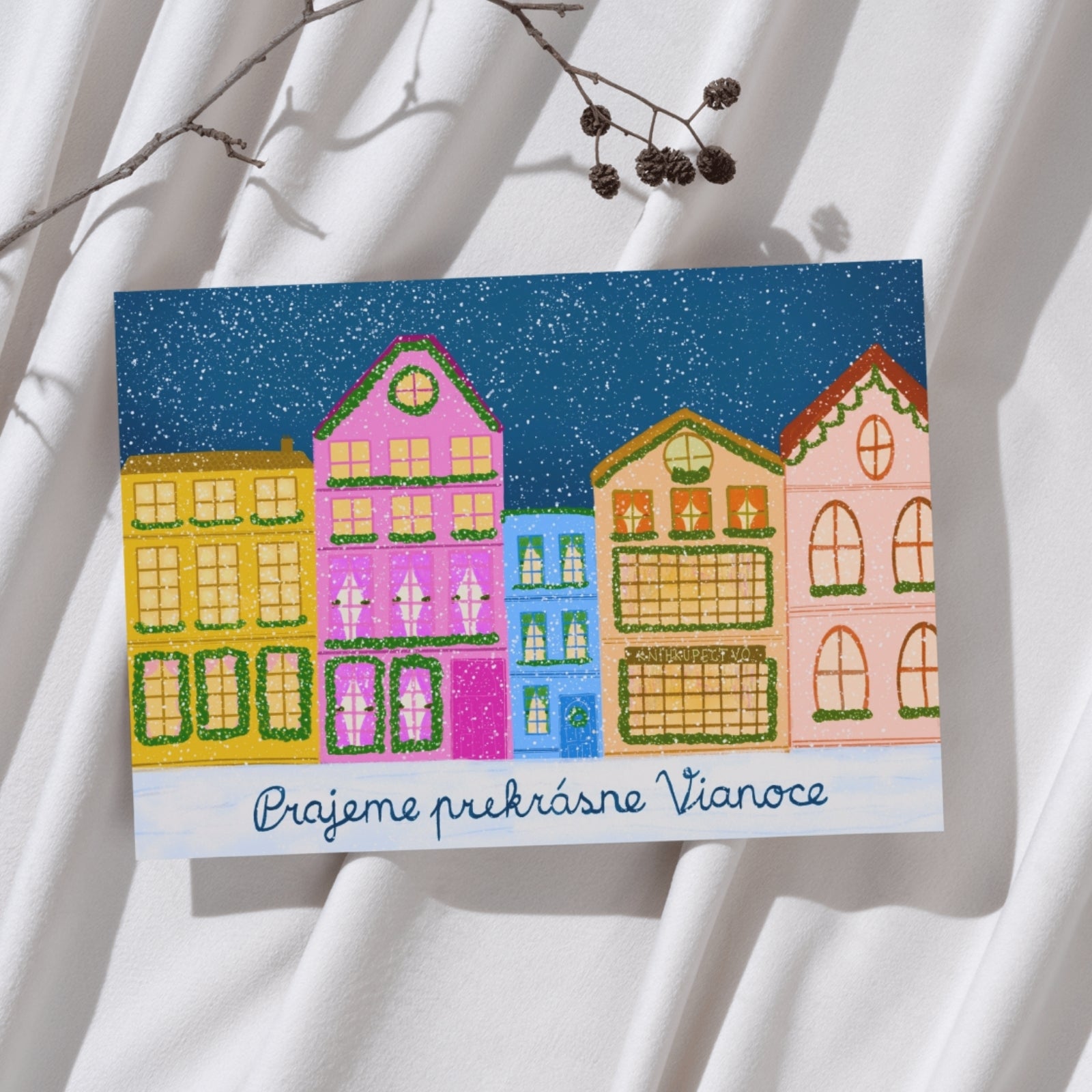 Vianočná pohľadnica s nápisom „Prajeme prekrásne Vianoce“ v sebe nesie atmosféru zimného večera, keď vonku ticho padá sneh a mestom sa rozžiaria svetielka. Autorská ilustrácia farebných domčekov vytvára hrejivú sviatočnú náladu, ktorá rozosmeje aj tých najzaneprázdnenejších.