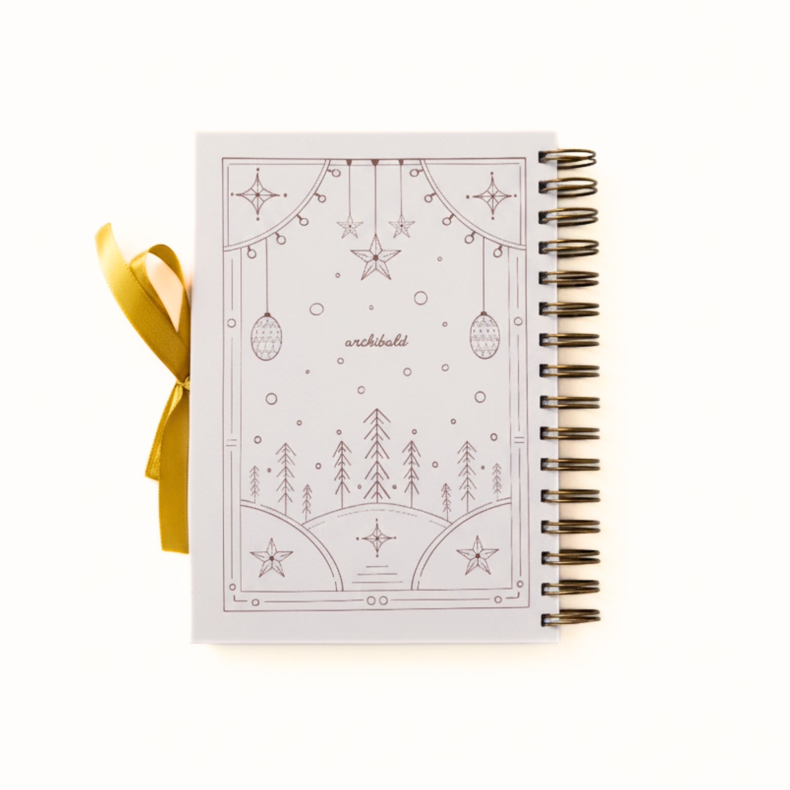 Jemný a elegantný zápisník ozdobený autorskou zimnou ilustráciou je viazaný pevnou špirálou a doplnený zlatou mašľou, ktorá mu dodáva nádych sviatočnej výnimočnosti.